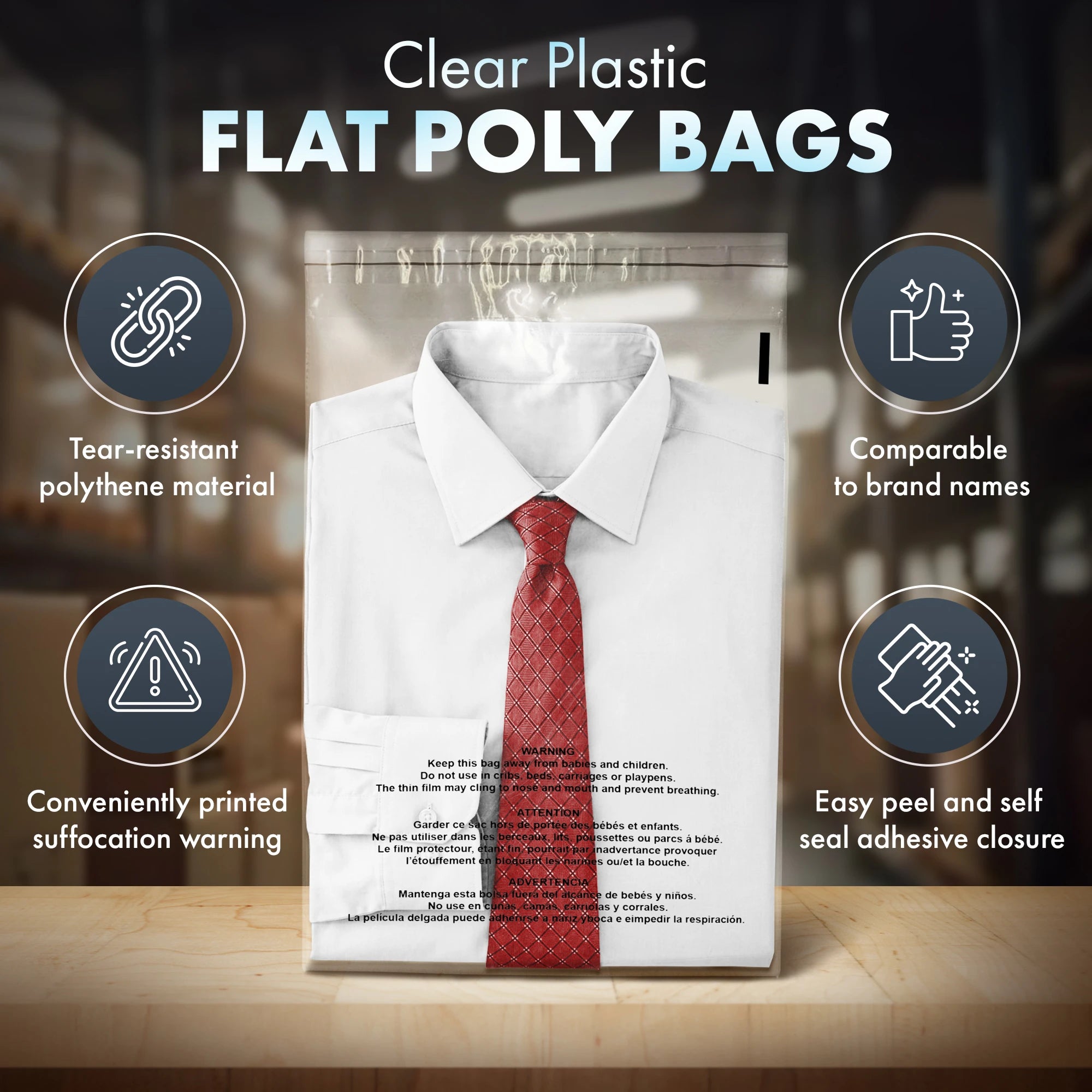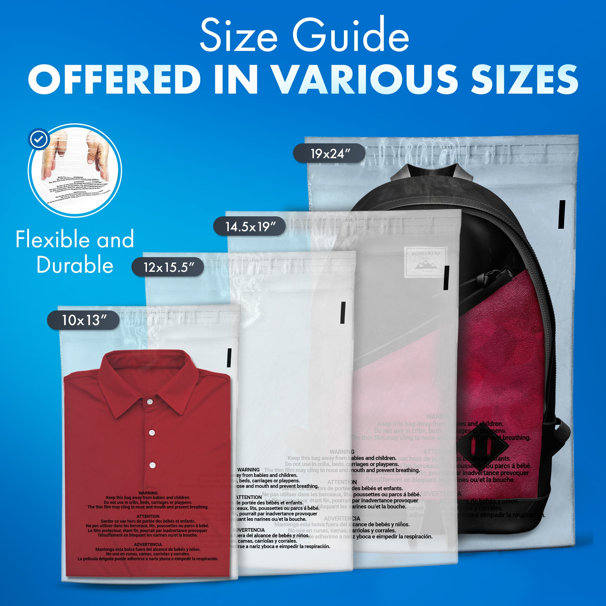 • Fits a wide variety of items ~ Use for all Retail and Storage needs ~ Suffocation Warning translated in 3 languages ~ Meets Amazon FBA seller requirements