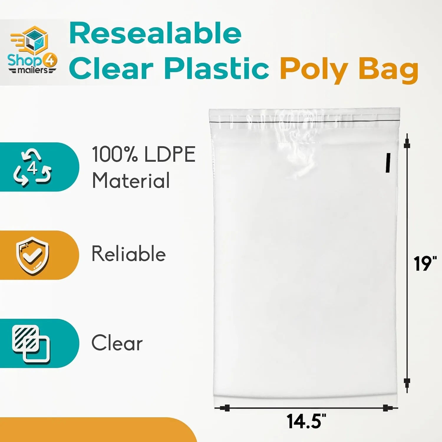 Store your products easily, safely, and efficiently thanks to our 14.5 x 19 Clear Plastic Self Seal Poly Bags. These medium size bags are perfect for retail, arts and crafts, shipping, and storage. Made with 1.5 mil clear poly plastic, our poly bags protect your products from weather, dirt, dust, and moisture.
